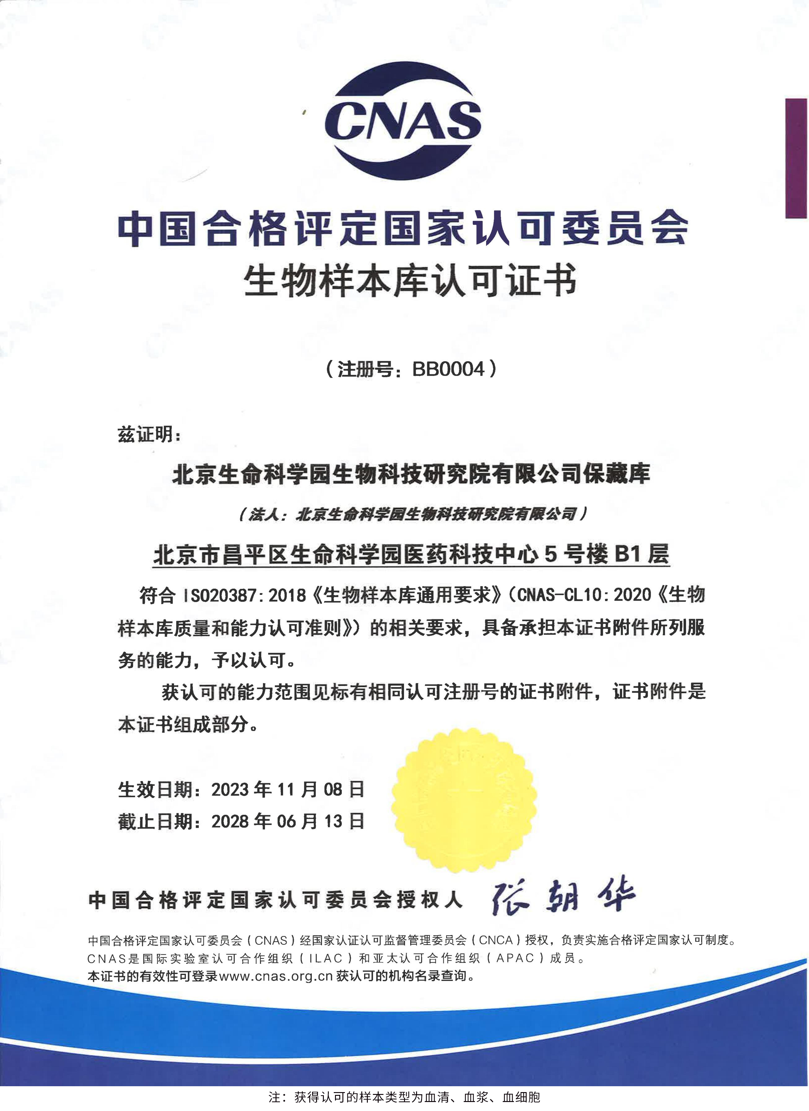 北京生命科學(xué)園生物科技研究院(以下簡(jiǎn)稱“北京生物樣本資源庫(kù)”)(Biobank of Life Science Park,簡(jiǎn)寫“BoLSP”)是一家由北京市科委和中關(guān)村生命科學(xué)園共同支持設(shè)立的第三方生物樣本庫(kù)公共服務(wù)平臺(tái),秉承北京重大疾病臨床數(shù)據(jù)和樣本資源庫(kù)(以下簡(jiǎn)稱“北京庫(kù)”)(Beijing Biobank of Clinical Resources,BBCR)十余年的發(fā)展成果,聚合眾多臨床樣本專家的專業(yè)共識(shí),致力于在生命科學(xué)、生物醫(yī)藥研究領(lǐng)域發(fā)揮銜接樣本資源持有者與研究者的橋梁作用,解決生物樣本資源開發(fā)上下游信息不對(duì)稱、資源共享困難等問題。研究院在北京中關(guān)村生命科學(xué)園昌平園區(qū)建立了2000㎡生物樣本庫(kù),最大存儲(chǔ)規(guī)模達(dá)1000萬(wàn)份。研究院遵循CNAS-CL10:2020《生物樣本庫(kù)質(zhì)量和能力認(rèn)可準(zhǔn)則》,同時(shí)結(jié)合北京庫(kù)過(guò)去十年的工作經(jīng)驗(yàn)與教訓(xùn),建立了一套完善的生物樣本保藏質(zhì)量管理體系,從人、機(jī)、料、法、環(huán)、控多個(gè)角度,實(shí)現(xiàn)生物樣本保藏過(guò)程的全面質(zhì)量控制,先后獲得國(guó)家科技部頒發(fā)的人類遺傳資源保藏行政許可證書和中國(guó)合格評(píng)定國(guó)家認(rèn)可委員會(huì)(China National Accreditation Service for Conformity Assessment,CNAS)頒發(fā)的“CNAS認(rèn)可證書”。